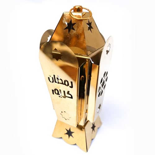 - Gold-colored metal Ramadan lantern (Fanoos) made from stainless steel with an electrostatic paint finish for durability and shine.