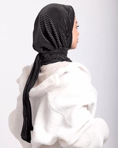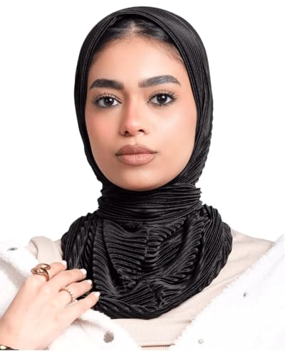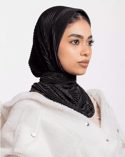 JAMILA جميلة - Premium Pleated Jersey Hijab, Black Ribbed Texture, Elegant Wrap Scarf, Soft Stretchy Material, Full Coverage Islamic Headscarf