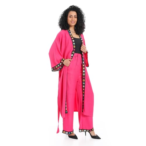 JAMILA - JAMILA Womens Stitched Edges Slip On Kimono And Pants Set - Fuchsia Women's plain kimono suit