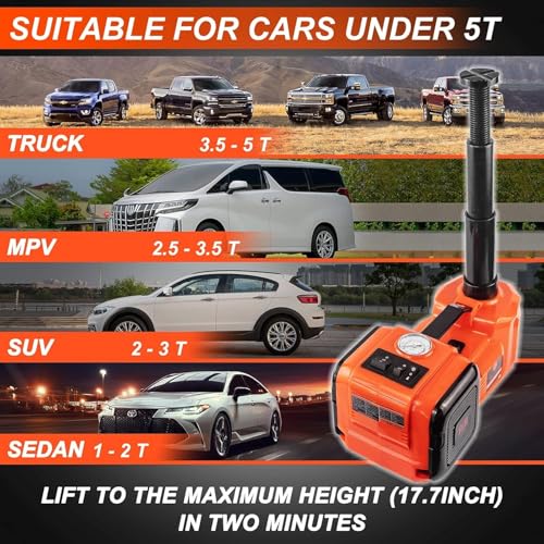 - [ Upgraded Electric Car Jack ] : Compared with previous versions, this car jack adapts LCD touch screen, bright digital display for reading and operation easily. The maximum load capacity is up to 5 ton (11023 lbs), lifting height range from 6 to 17.7 inch. It can quick lift, just take less than 2 minutes to reach maximum height