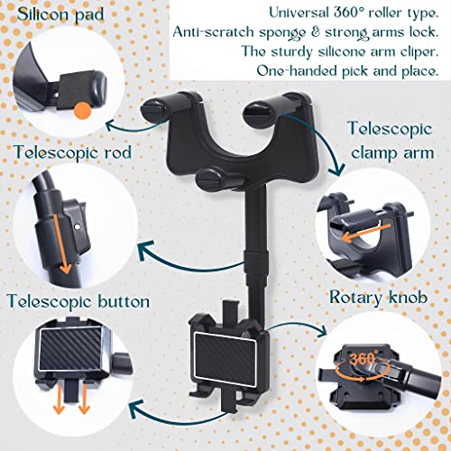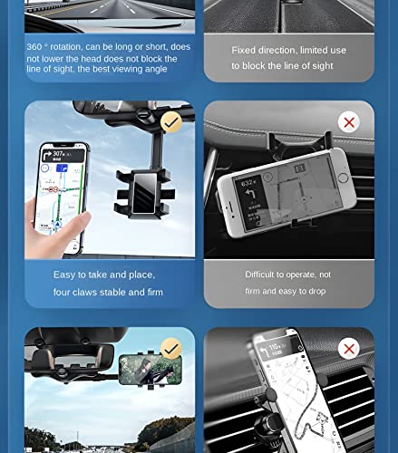 - ONE-HAND SAFE OPERATION: You can place or take the phone on this rearview mirror holder with one hand while driving. The four-claw design of our rotatable and retractable car phone holder holds the phone firmly in place no matter how bumpy the road is. The main driver (one-handed operation) can navigate the phone and listens to music, and GPS makes calls. The simple design of this car accessory can bring you a new driving experience.