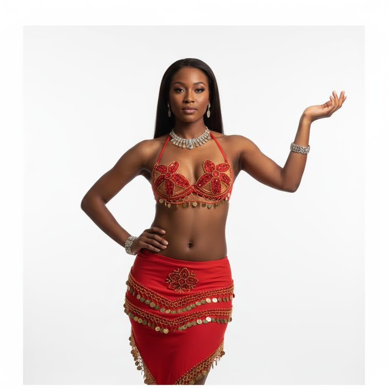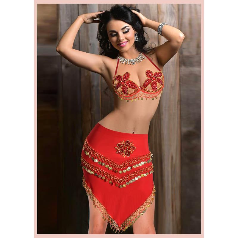 JAZZEEL - JAZZEEL Belly Dance Costume Set, 2-Piece Bra and Skirt with Floral Beaded Embroidery and Gold Coins, Red Oriental Dance Outfit for Women, Adjustable Fit, Perfect for Stage Performances, Festivals