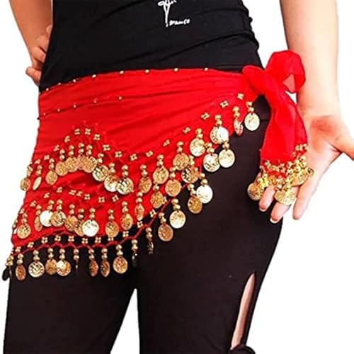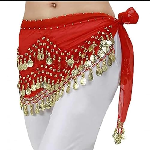 JAZZEEL - سكارف خصر للرقص الشرقي مع عملات ذهبية، أحمر، مقاس واحد، أكسسوار أزياء للنساء والفتيات، مثالي للعروض أو الفصول الدراسية أو الحفلات من جازيل