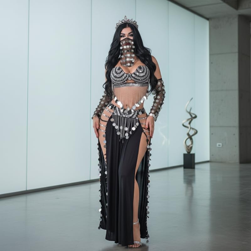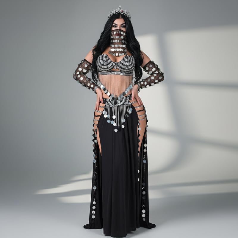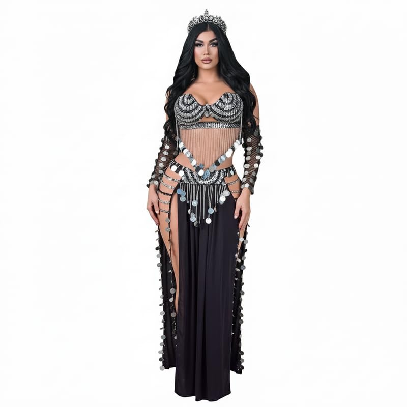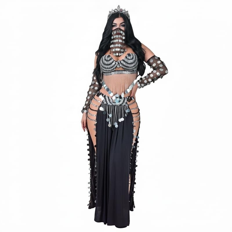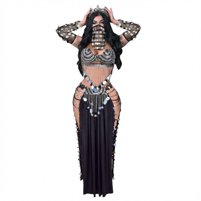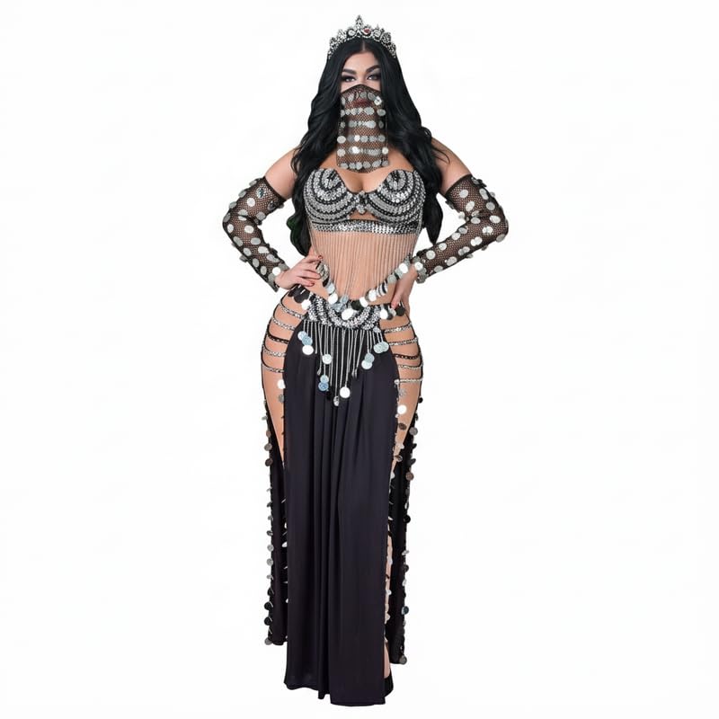 JAZZEEL - JAZZEEL Embellished Galabeya Set, Stretch Fabric with Coin Trim Details and Multi-Piece Costume Design, Home Wear and Party Outfit for Women, Elegant Style for Shows and Special Occasions, Black