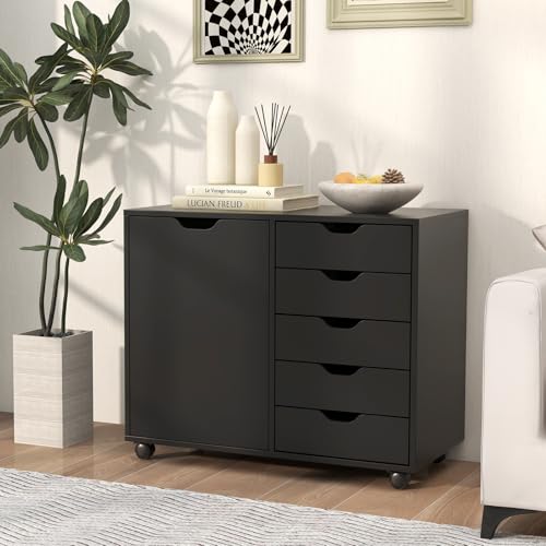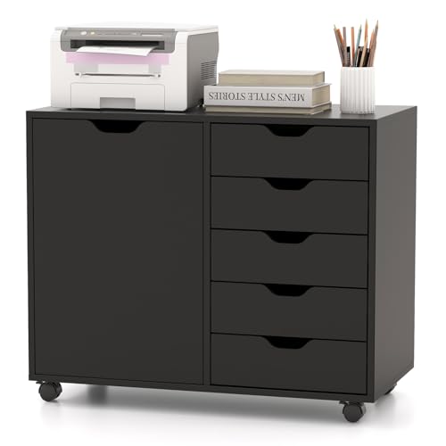 JAZZEEL - JAZZEEL Mobile File Cabinet with 5 Drawers, Rolling Lateral Stationery Storage Organizer with Wheels & Door, Home Office Printer Stand Side Filing Cupboard - 79x39x65cm, Black