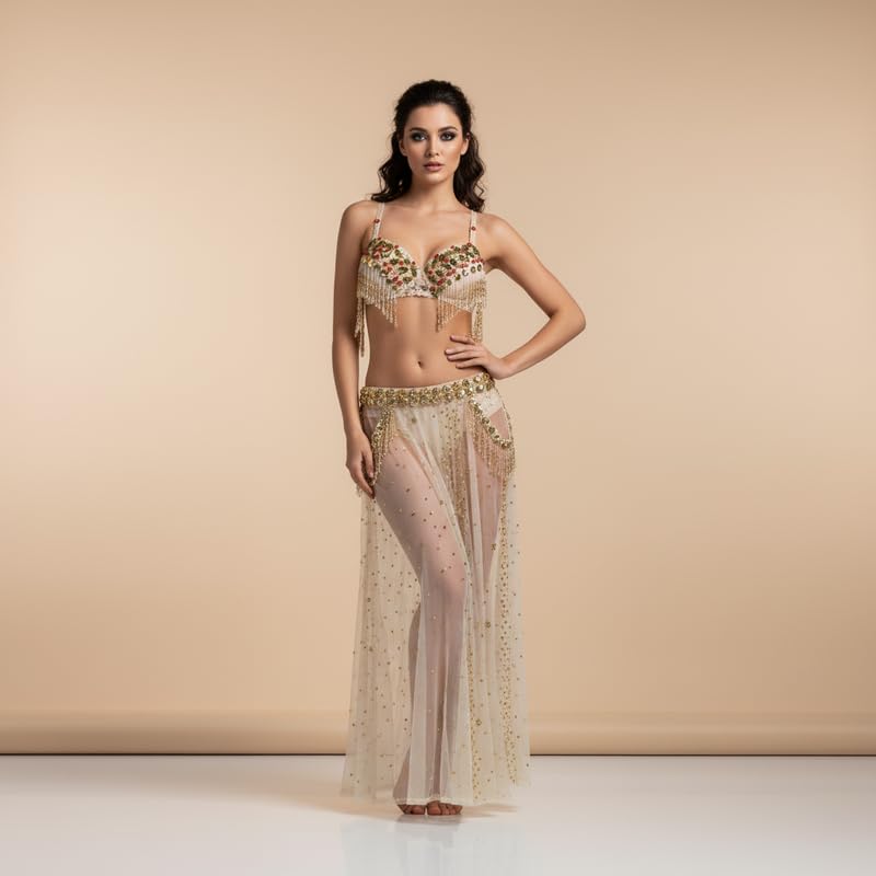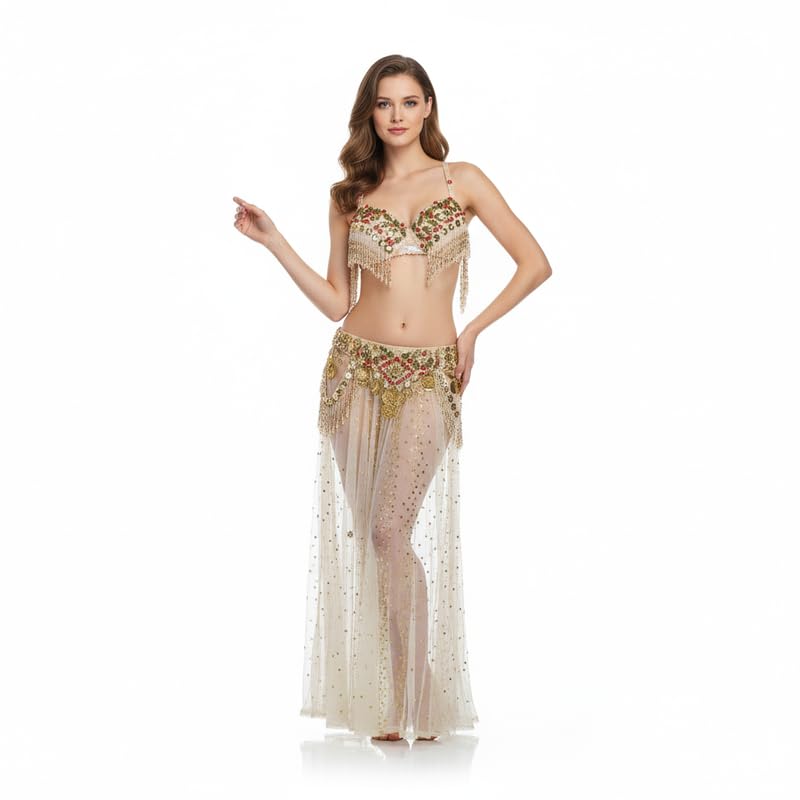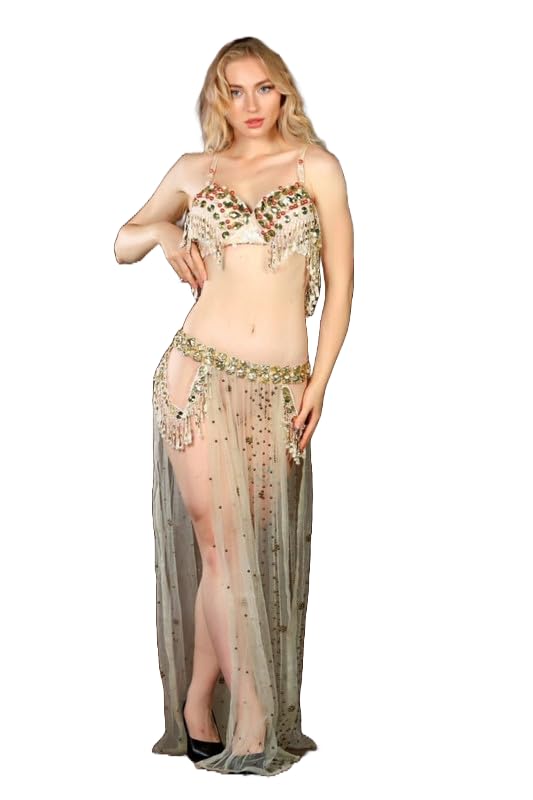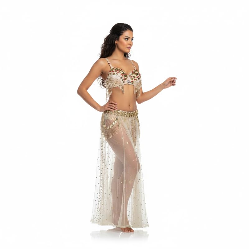JAZZEEL - JAZZEEL Professional Belly Dance Costume, 2-Piece Hand-Embroidered Bra & Hip Belt with Tassels & Rhinestone Sheer Skirt. Elegant Oriental Outfit for Stage Performance, Gold