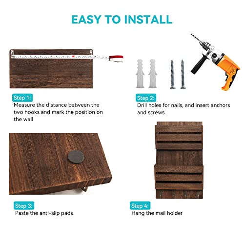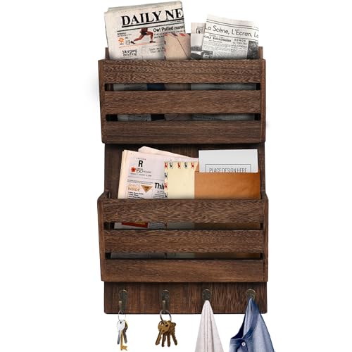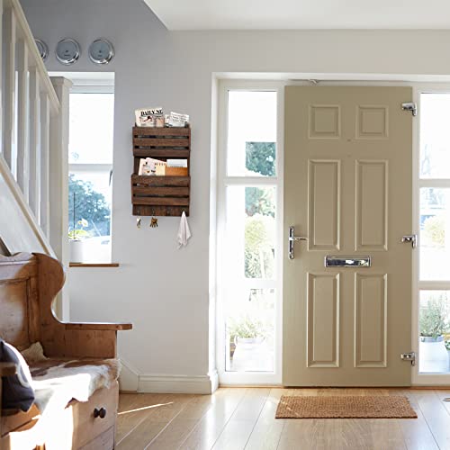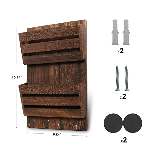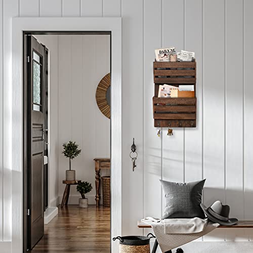 JAZZEEL - JAZZEEL Rustic Wooden Mail Organizer Wall Mount with 4 Key Hooks, Hanging Mail Sorter & Key Holder for Entryway, 2-Slot Wall File & Magazine Holder for Home Wall Decorative