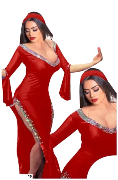 JAZZEEL - JAZZEEL Women’s Dance Dress, Shiny Sequin Trim with Long Sleeve Flare Cuffs and High Side Slit, One Size Fits 50 to 75 kg, Outfit for Stage, Party and Special Events