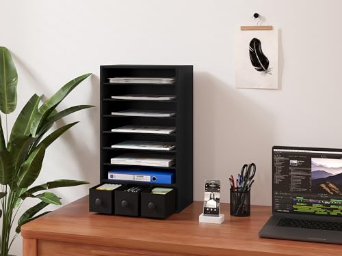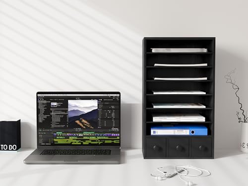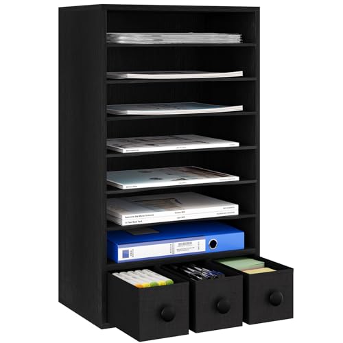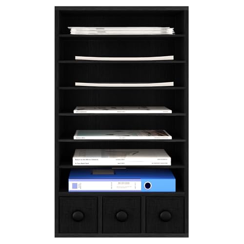 JAZZEEL - JAZZEEL Wood Desktop File Holder, 8 Tier Paper Organizer, 3 Drawers, Black, A4 Magazine Storage Filing Rack for Office Desk Tidy, Heavy Duty Document Sorter, Multi Functional Cabinet.