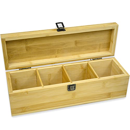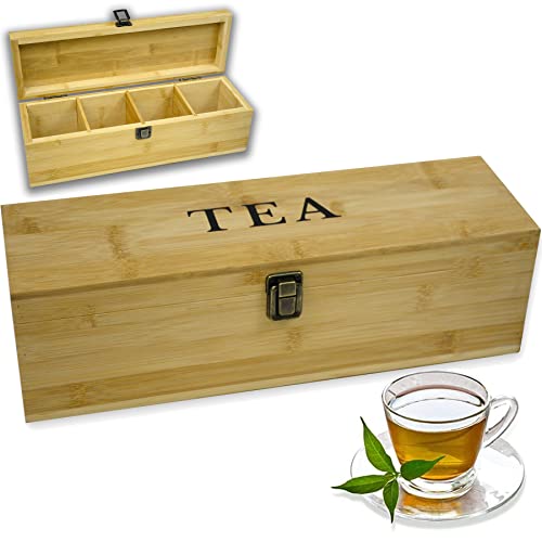 JAZZEEL - JAZZEEL Zen Earth Inspired Bamboo Tea Organizer Box (14.3"x4.4"x4.2"), A Chemical-Free Eco-Friendly Wooden Storage Chest with Adjustable Cubbies and "TEA" Print Design
