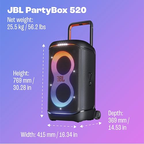 JBL - JBL PartyBox 520 Portable Battery Powered Party Speaker with AI Sound Reinforcement, Up to 15 Hours Playtime, IPX4 Splash Proof, Multi-Radiator Connection
