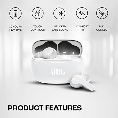 JBL - سماعات اذن لاسلكية ترو 200TWS مع ميكروفون تدعم وقت تشغيل 20 ساعة وصوت جهوري عميق وبلوتوث تستخدم سماعة اذن فردية او كلاهما 5.0 نوع سي ودعم مساعد صوتي للموبايلات من جي بي ال (ابيض)، في الاذن