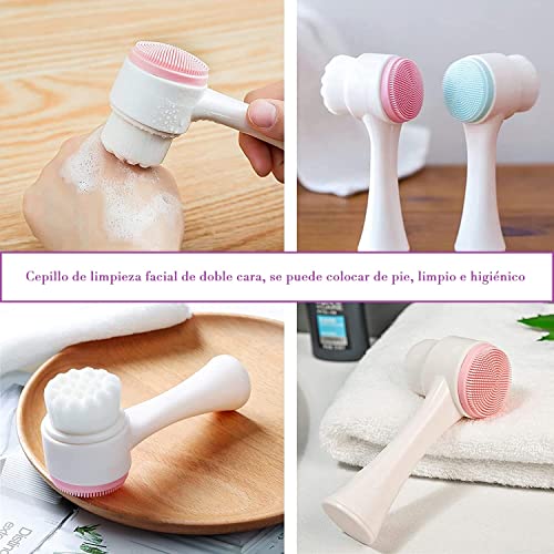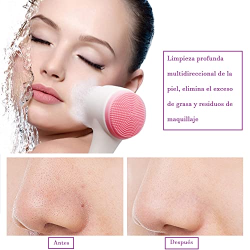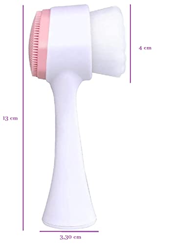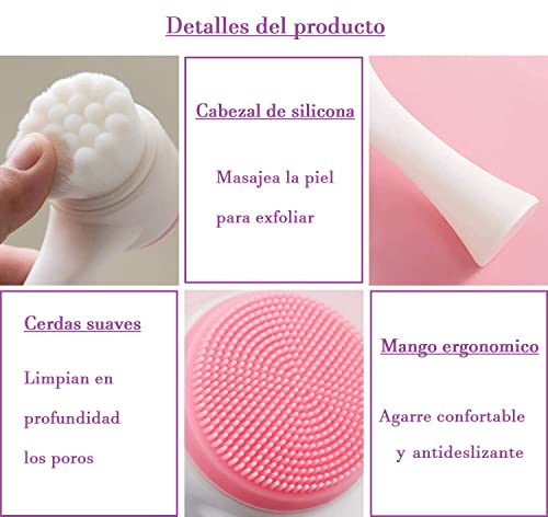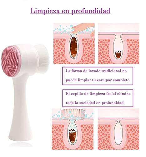 - (2 IN 1 BRUSH)The cleansing and exfoliating facial brush is composed of nylon bristles for foaming and facilitating face cleansing and an exfoliating silicone brush on the other side that allows you to remove makeup, debris and blackheads.