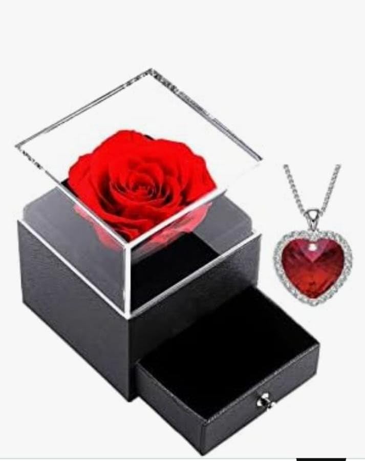 - صندوق هدايا رومانسي: مجموعة أنيقة تتضمن وردة حمراء محفوظة في علبة أكريليك شفافة مع قلادة قلب كريستالية، مثالية للمناسبات الخاصة