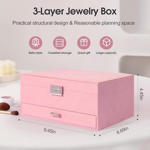 KILEYOT - Jewelry Organizer Box, 3-Layer Jewelry Storage, Soft Lining Jewelry Storage Case Velvet Leather with Lock, Removable Tray for Jewelry, Vintage Jewelry Box Gift for Women, Girls, Mom, Wife