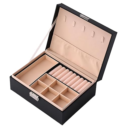 - 6. With its space-saving size, this jewelry organizer features 2 trays that elegantly hold necklaces, bracelets, rings, and earrings in one neat location. Its compact design makes it suitable for daily use while looking great on any dresser or shelf, maximizing both functionality and aesthetics.