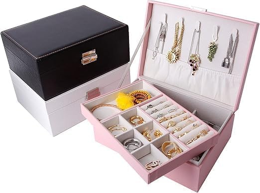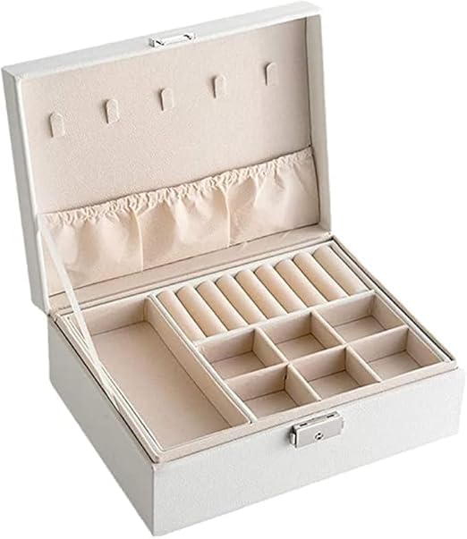 - تصميم مزدوج الطبقات: صندوق مجوهرات أنيق من الجلد الصناعي بطبقتين يوفر مساحة تخزين واسعة لتنظيم الخواتم والأقراط والسلاسل والأساور بشكل منظم ومرتب