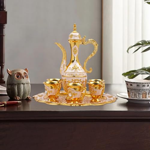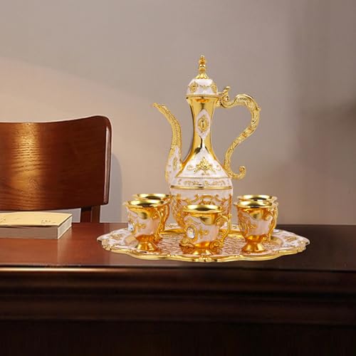 Jiabailie - Turkish Tea Set,Vintage Turkish Coffee Set w/Pot and 6 Cups,Metal Luxury Moroccan Tea Glasses,Craft Tea Tray Teapot,Wine Pot Kit European Jug for Home Decor Birthday Wedding (Gold White)