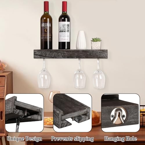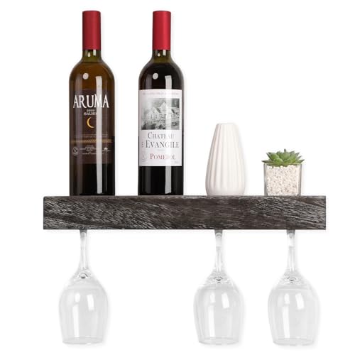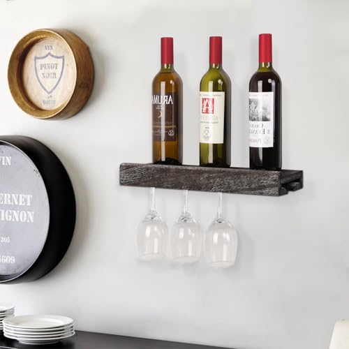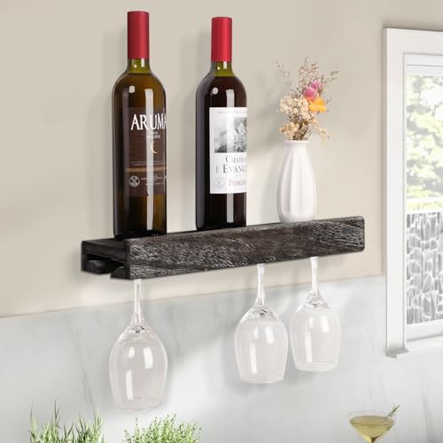 JJUUYOU - JJUUYOU Wall Mounted Wood Stemware Rack Hanging Shelf Glassware Holder Bar Organizer with 4 Bottles and 4 Wine Glass Storage 17 Inch Long
