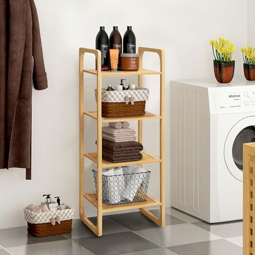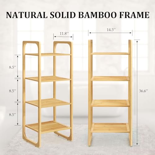 - ✅ Durable & Eco-Friendly Bamboo – Crafted from 100% natural bamboo, this 4-tier storage shelf (14.57"L x 11.89"W x 36.69"H) offers superior durability and a smooth, waterproof surface. The eco-friendly bamboo material is lightweight yet sturdy, ensuring long-lasting use.