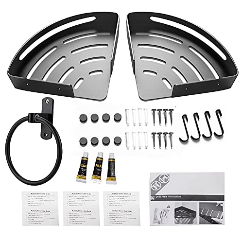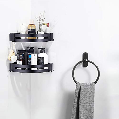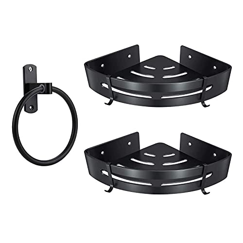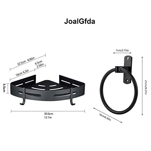 JoalGfda - Bathroom Shower Corner Shelf towel ring No Drilling Aluminum Rustproof Adhesive Bathroom Shelf Wall Mounted for Shower Kitchen (BLACK, Shelf and Towel Ring)