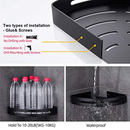 - Wide Application: Corner shower shelf perfect for both shower corner, bathroom, lavatory, cubicle, kitchen, bedroom, etc. Glue installation suitable for smooth walls, such as metal walls, tile walls, glass walls, solid wood walls, marble walls. Drilling installation suitable for painted wall, plaster wall, cement wall and wallpaper.