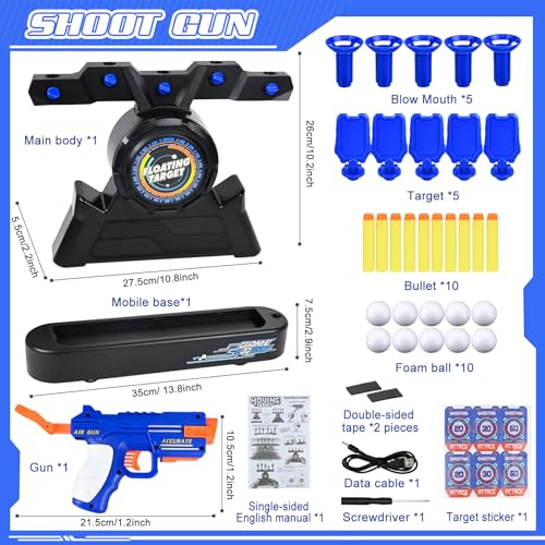 - Children's shooting toy set: you will receive a complete children's floating ball shooting game set. Contains 1 piece shooting disc, 10 foam balls, 10 soft foam balls, 1 toy gun, 1 USB charging cable, 1 small screwdriver. (Some parts of the shooting disc need to be assembled a little)