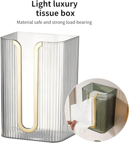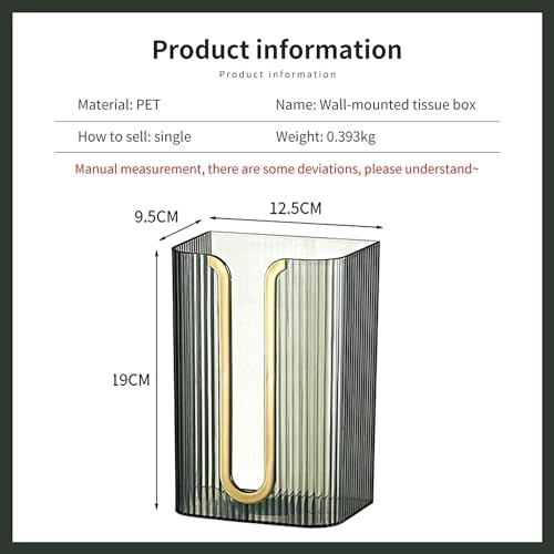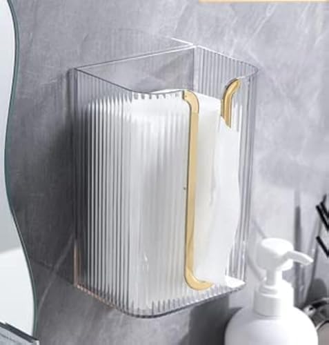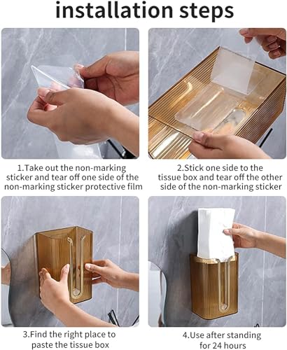 - [Wall-mounted Design] - The wall-mounted tissue box does not need to be punched, and comes with non-marking adhesive, which can be easily pasted where tissue is needed, without damaging the wall, and is easy to install. The tissue dispenser is waterproof and drop-proof, and the transparent material makes it easy to see the amount of tissue and is easy to replace.