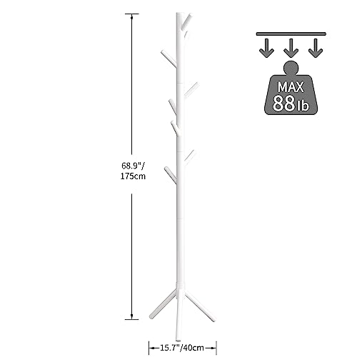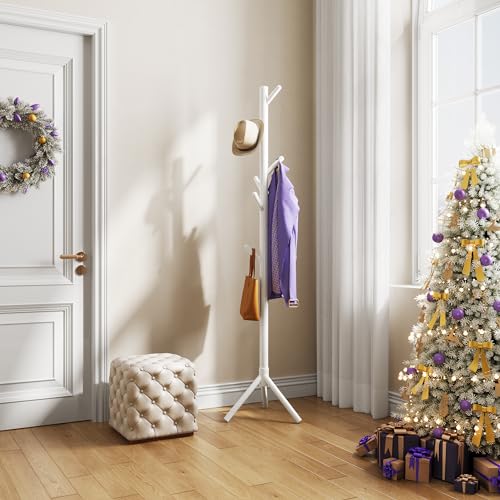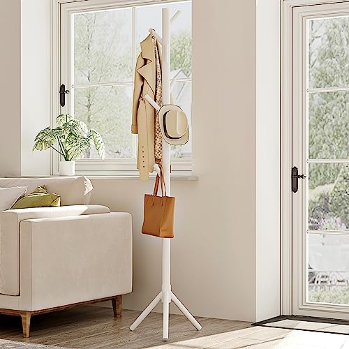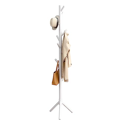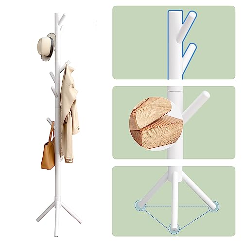JOISCOPE - JOISCOPE Coat Rack Stand, Wooden Coat Tree, Free Standing Hall Tree with 3 Height Options and 8 Hooks, Clothes Stand for Coats, Hat, Handbag, Umbrella, for Home, Office, Entryway, White