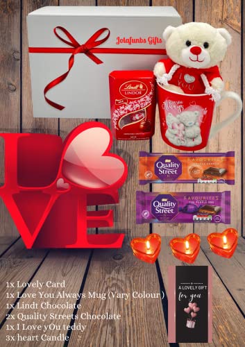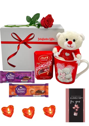 JOLAFUNBS - JOLAFUNBS Chocolate Hamper Gift Box Lindt Chocolates, Quality Street Chocolate Bars, teddy bear, Love Heart Sweets Mugs, Heart Candle &Card - Valentines,Birthday, Mother Days, Father Day & More