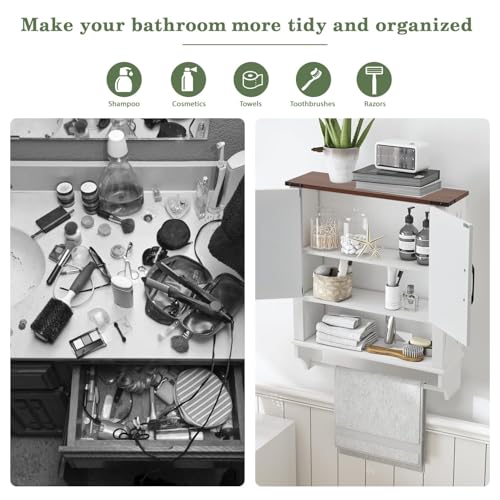 - 【BATHROOM STORAGE CABINET】Measuring 23.5"(L)x7.8"(W)x24"(H), this elegant wall-mounted storage cabinet offers three spacious shelves and a towel bar at the bottom, maximizing storage while saving valuable floor space. Ideal for organizing toiletries and bathroom essentials.