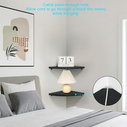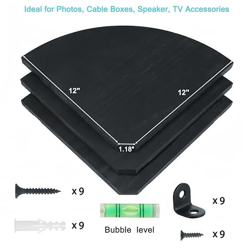 JORIKCHUO - رف زاوية 12 انش، مجموعة من 2 رف عائم من الخشب الصلب للجدار، رف عائم دائري يثبت على الحائط لغرفة النوم وغرفة المعيشة والمطبخ (اسود-12 انش)