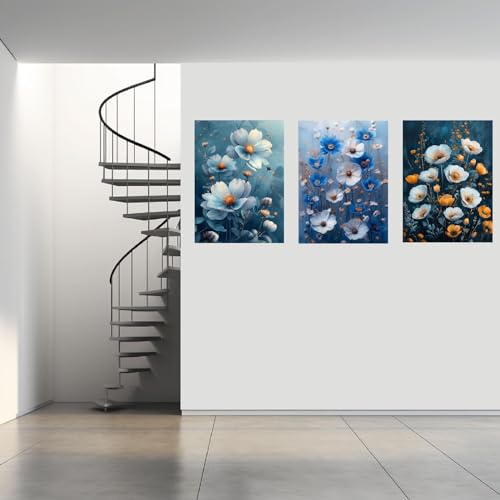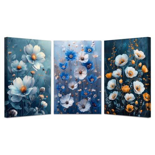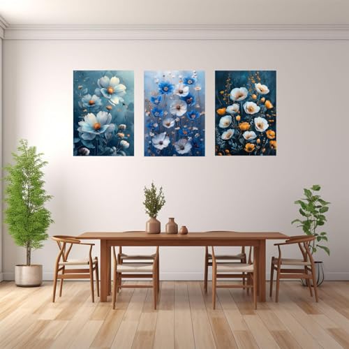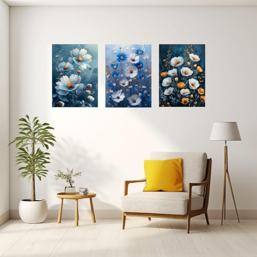 JOSUE - JOSUE 3 Pieces Flower Wall Art Canvas Large Wall Art Blue,white Painting for Living Room Home Office Decorations-40x60cm(16x24in) x3 Framed