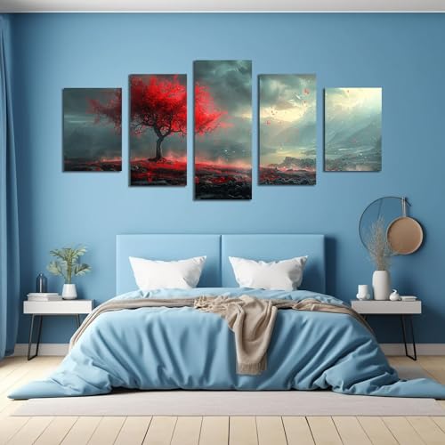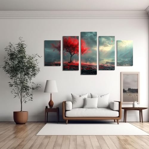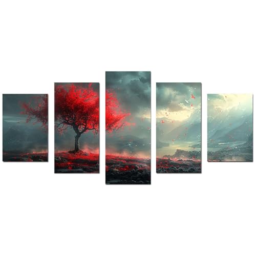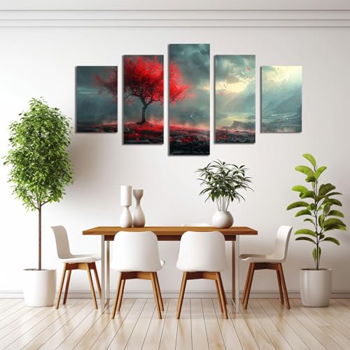 JOSUE - JOSUE 5 Pieces Tree of Life Canvas Art Panel Painting Tree Under Dark Clouds Art Panel Decor Canvas Painting,Red Abstract Interior Painting with Art Panel Art for Inn Offense Home Living Room Dining