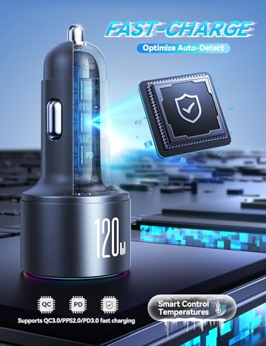 - [Safe, Stylish & Night-Friendly] Upgrade your drive with this fast car phone charger for iPhone 16, engineered for durability and protection against overheating. Car usb charger multi port with LED ambient lights illuminate ports effortlessly in low light. The scratch-proof PC shell adds rugged elegance, and the subtle glow enhances nighttime visibility without distraction—perfect for stress-free charging on the go.