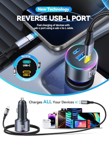 - [Meets New Technology] 120W Super Fast USB C Car Charger. Innovative USB-L port design, simply plug the included 30W PD C to L cable into the USB-L port to activate 30W PD output from the C port for fast charging compatible with Samsung, Pixel, iPad and iPhone 16-15 series devices. When using C port for input and L port for output, it can charge for iPhones pre-15 series. This car phone charger works with all cables, perfect for road trips/daily drives! reducing e-waste!