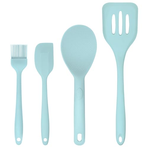 JS Gourmet - JS Gourmet 4 Pcs Silicone Kitchen Utensils Set, Heat Resistant, Non Scratch Cooking Spoon Set, Spatula, Slotted Turner, Basting Brush and Rice Paddle for Nonstick Cookware - Pastel Blue