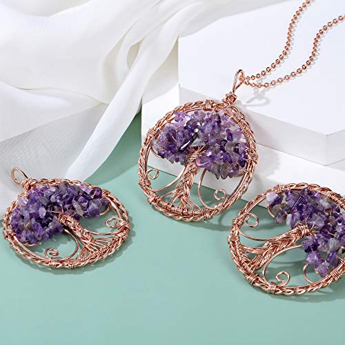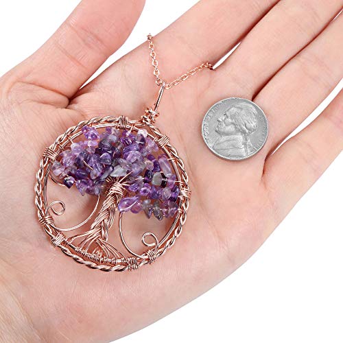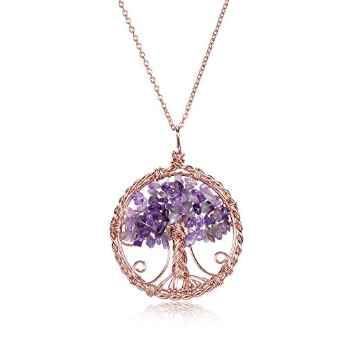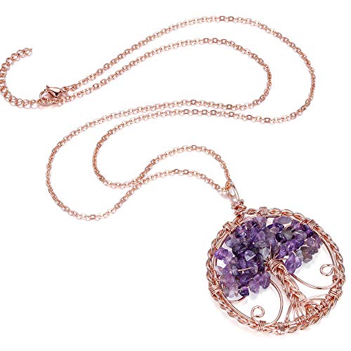 JSDDE - Natural Gemstones Tree of Life Pendant Necklace Rose Gold Wire Wrap Healing Stones Pendant Chain Reiki Healing Lucky Charm Jewellery for Women, Gemstone, Amethyst