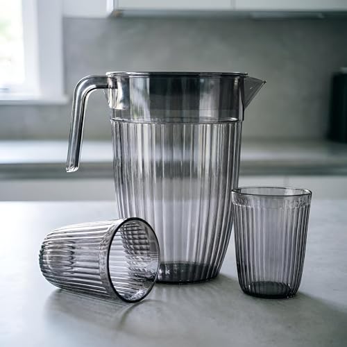 - This premium plastic drink set includes a 1-liter pitcher with two matching cups, designed for effortless serving during family meals, parties, or daily hydration needs, ensuring a clean, spill-free pouring experience thanks to its ergonomic, non-slip handle.