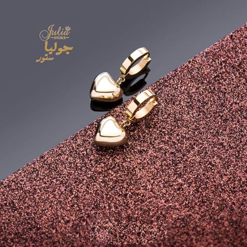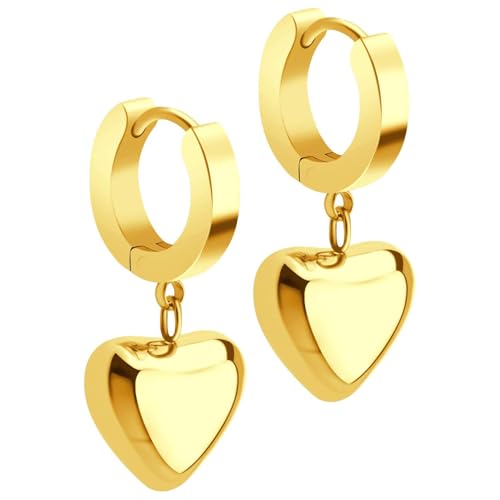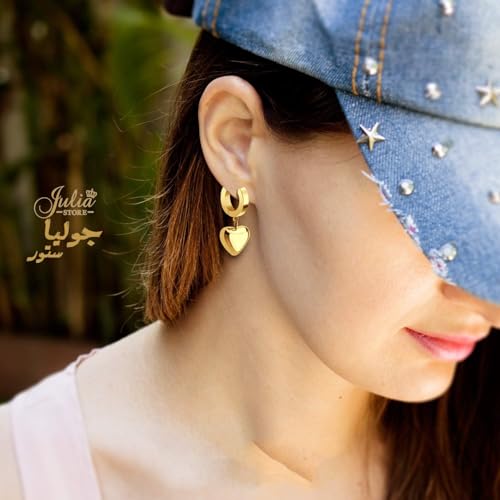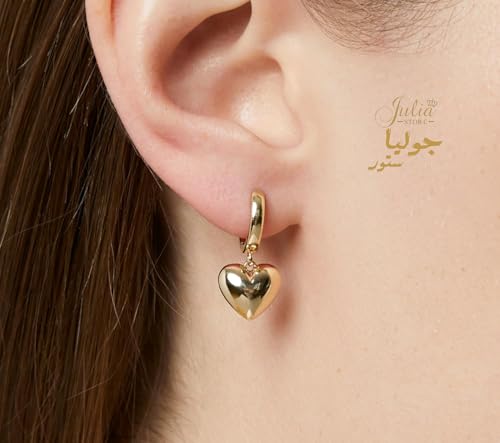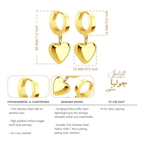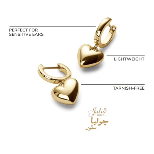 Julia Store - Julia Store 18K Gold Plated Stainless Steel Cute Dangle Puffed Heart Charm Huggie Hoop Hypoallergenic Water-Resistant Tarnish-Free Earrings for Women