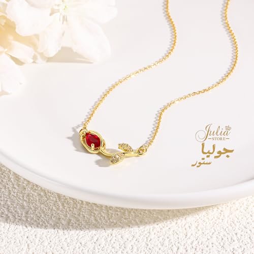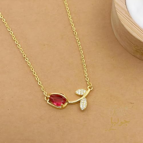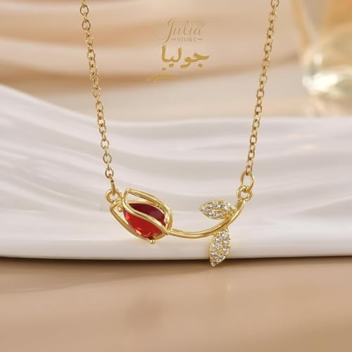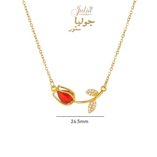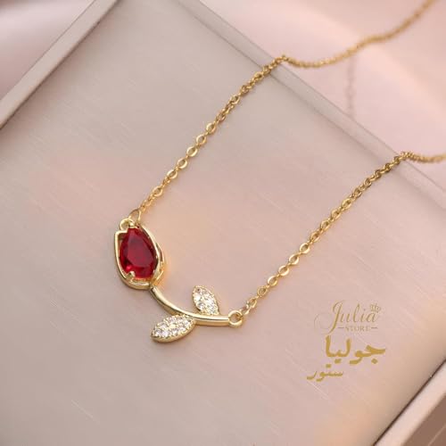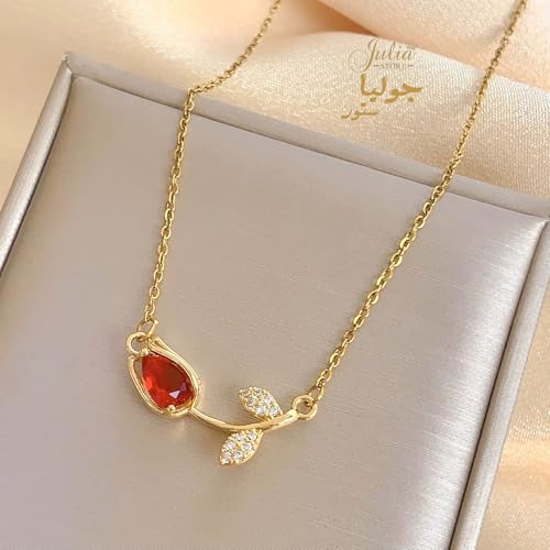 Julia Store - Julia Store 18K Gold Plated Stainless Steel Initial Love Crystal Tulip Pendant Chain Choker Flower Necklace Link Chain Choker Necklace for Women Girls Jewelry Gift (Red)