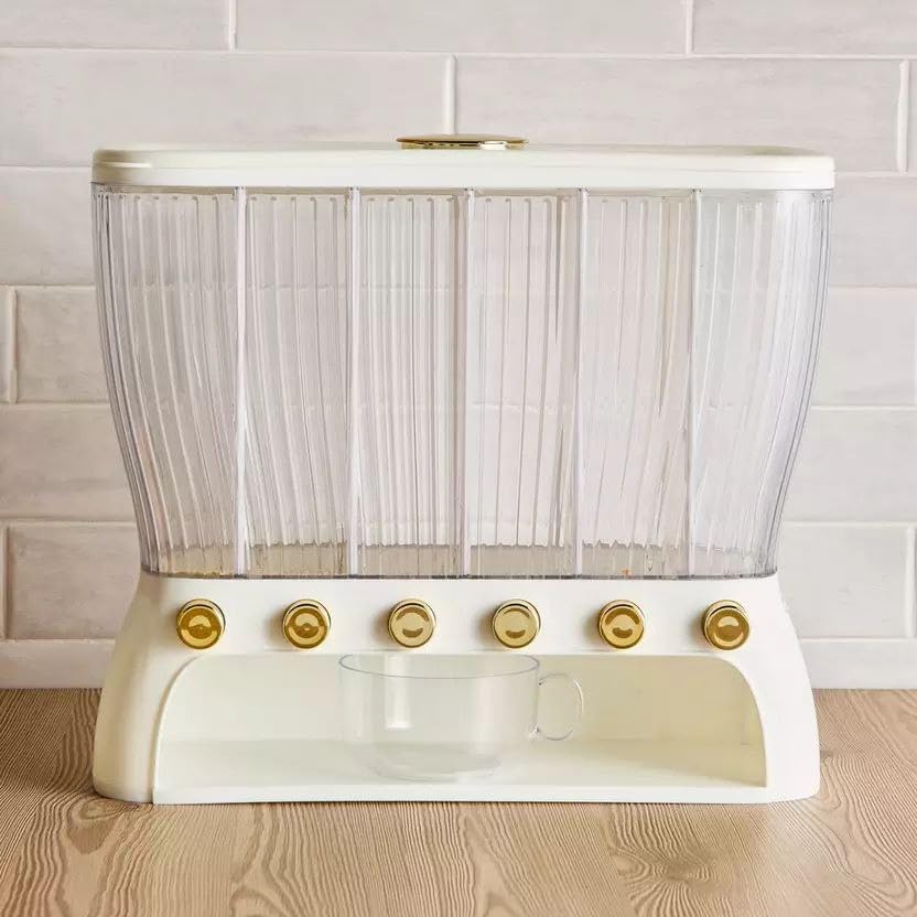 - سعة جامبو وتصميم متعدد الأقسام: يتميز هذا الديسبنسر بسعة تخزين كبيرة ومقسمة إلى 6 خانات منفصلة، مما يسمح لك بتخزين وتصنيف أنواع مختلفة من البقوليات أو الحبوب في نفس الجهاز دون أن تختلط. هذه الميزة العملية توفر عليك مساحة التخزين وتسهل عليك الوصول إلى كل صنف.