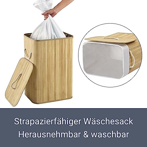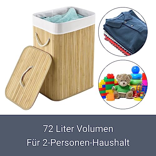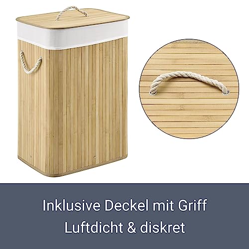 Juskys - Juskys Bamboo Laundry Basket Curly 72 Litres Natural – Laundry Hamper with Lid, Handle & 1 Compartment – Fabric Laundry Bag Removable & Washable Laundry Basket