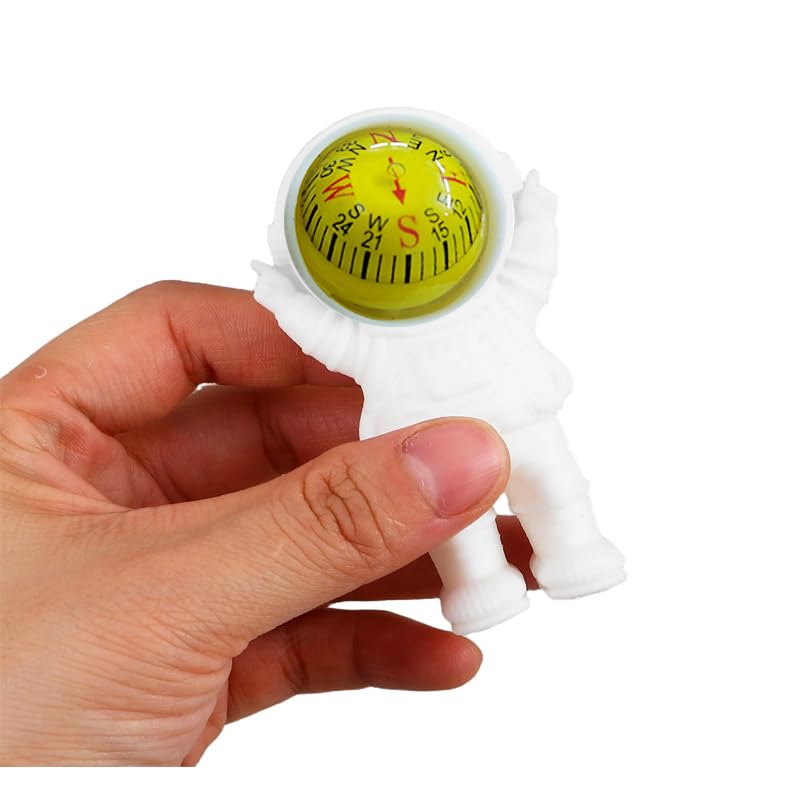 - Small plastic astronaut with a full white space suit and a headpiece with a directional compass.