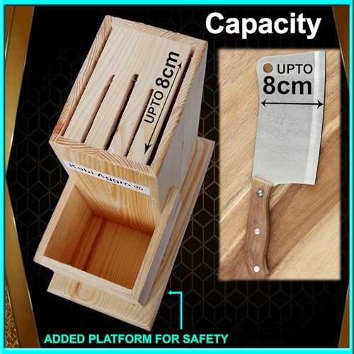 - المادة والصناعة – حامل السكاكين الخاص بنا (بدون سكاكين) متين للغاية ومصنوع ليدوم لسنوات لأنه مصنوع من خشب الصنوبر. مزود بـ 5 فتحات أفقية لتقليل تآكل شفرات السكاكين، ومصمم بزاوية لسهولة الاستخدام، ويناسب جميع الأحجام بدءًا من سكاكين اللحم الصغيرة إلى سكاكين الشيف الكبيرة، وهو عبارة عن بلوك لحفظ السكاكين. المقاسات: الطول × العرض × الارتفاع (20 سم × 11 سم × 20.5 سم).