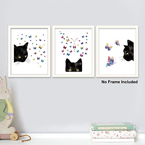 KAIRNE - KAIRNE Black Cat With colorful Butterfly Art Print,Set Of 3(8”X10”) Watercolor Animals Canvas Poster Painting,Modern Wall Art For Home Decor,Unframed