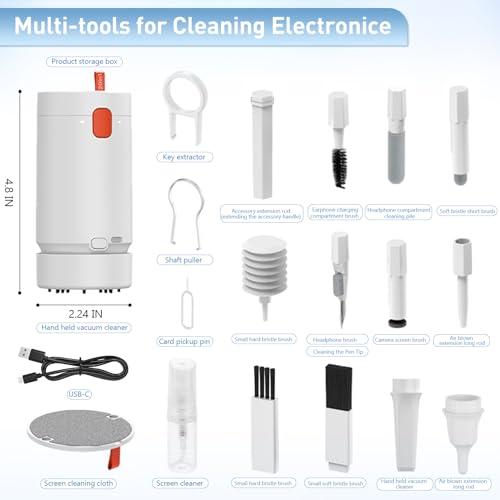 - 21 IN 1 Electronic Cleaning Kit: Our electronics vacuum cleaner kit contains many professional cleaning tools and a mini vacuum cleaner. It can clean most of your electronic devices such as cell phone, earbud, keyboard, laptop, computer, PC, camera, car center console, mechanical keyboard, headphone, tablet, TV, screen.