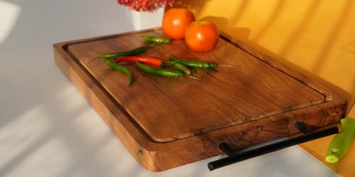 Kaizen Casa - لوح تقطيع من خشب الاكاسيا بمقابض معدنية من كايزن كاسا - لوح تقطيع وتقديم متعدد الاغراض للمطبخ والجبن واللحوم والخضروات | لوح جزار خشبي فاخر (34 × 25 × 2.5 سم)