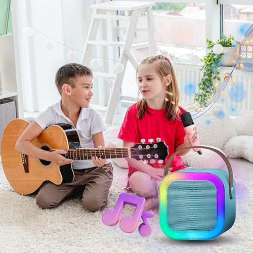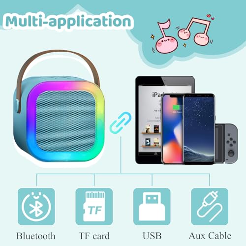 - 🎮【Multifunctional Mini Karaoke Machine】Built with Bluetooth 5.0 technology, instant pairing with your devices with great stability. It is compatible with various devices such as mobile phones, iPad and PC. It also supports TF card, Bluetooth and headphone output port on the back. The wireless microphone will automatically connect with the speaker when it is turned on, at a distance of up to 10 meters.
