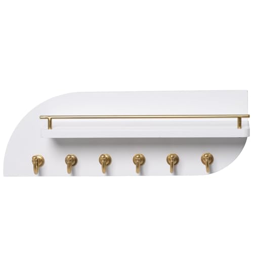 Karisky - Key Holder for Wall, Decorative Key and Mail Organizer with 6 Sturdy Metal Hooks and Floating Shelf, 14 Inches Wood Wall Mounted Key Rack for Entryway, White and Gold